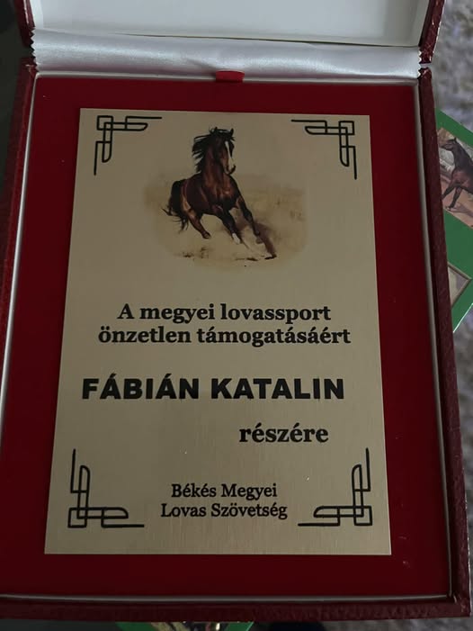 A Békés Megyei Lovasszövetség egyesületünk tagját Fábián Katalint ônzetelen segítèse ès támogatása elismeréseként kitüntetèsben rèszesítette.