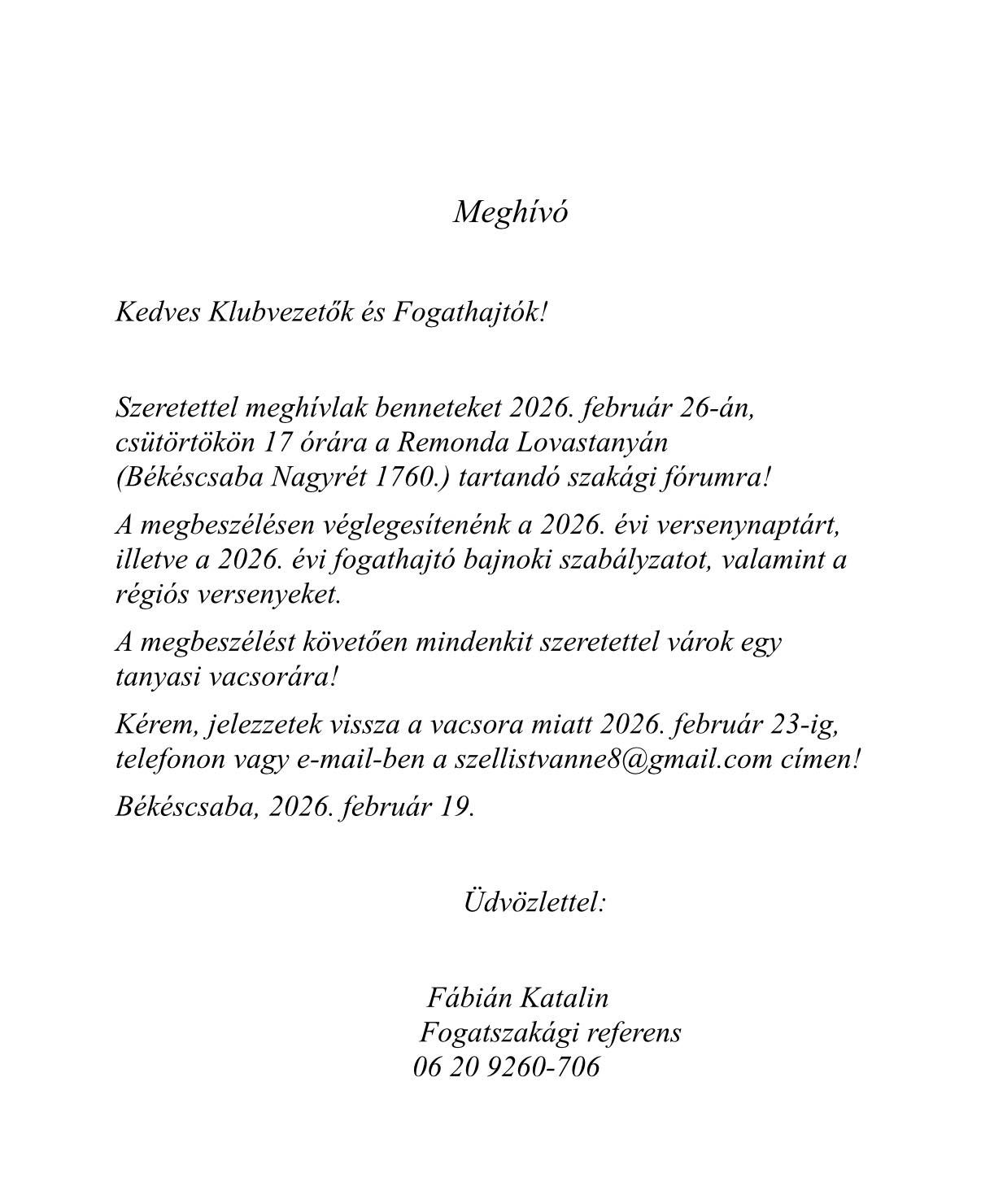 Fábián Katalin, a megyei elnökség fogathajtásért felelős tagja a Remonda Tanyára hívta össze a fogathajtásban érdekelt klubvezetőket, versenyrendezőket, versenyzőket. A fórumon részt vett Susánszky Pál, a megyei szövetség elnöke is. A hagyományoknak megfelelően ezen a fórumon beszélték meg a 2026-os megyei bajnokság versenyrendszerét, a versenynaptárt.
